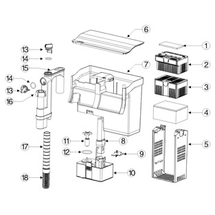 - Filtermateriaal: Fijne filtervlies, filterspons, actieve kool en bioballen