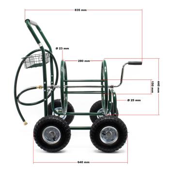 Met deze waterslangwagen kunt u elke hoek van uw tuin bereiken, zelfs wanneer de waterkraan verder weg ligt. Stevig stalen frame en grote draaihendel voor het op- en afrollen van de waterslang. De vier grote luchtbanden zijn uitermate geschikt voor oneffen oppervlakken en bieden dus een grote bewegingsvrijheid op elk terrein. Deze waterslangwagen is de oplossing voor een gemakkelijke en efficiënte besproeiing van de tuin, zowel in de professionele sector als voor privégebruik.