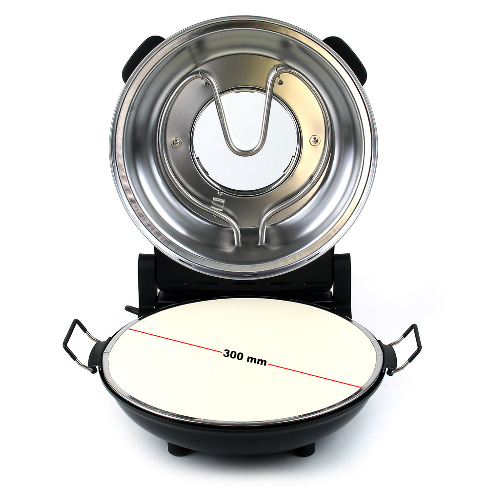 Om ervoor te zorgen dat het bakresultaat kan tippen aan dat van een professionele oven, is de pizza-oven uitgerust met een keramische steenplaat. Deze heeft een diameter van 32 cm. Dankzij de plaat wordt gegarandeerd dat het deeg niet te zacht blijft of verbrandt. Dit is omdat de steen het overtollige vocht van het deeg absorbeert en de warmte van de oven opslaat. Omdat de steen de warmte gelijkmatig afgeeft wordt de bodem van de pizza heerlijk krokant. Het duurt slechts ongeveer 15 minuten om een zelfgemaakte pizza te bakken. Voor een diepvriespizza heeft de pizzaoven slechts zes tot acht minuten nodig.