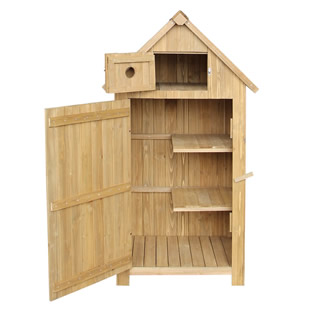 - De kast is gemaakt van vurenhout en het dak is bekleed met waterafstotend dakleer